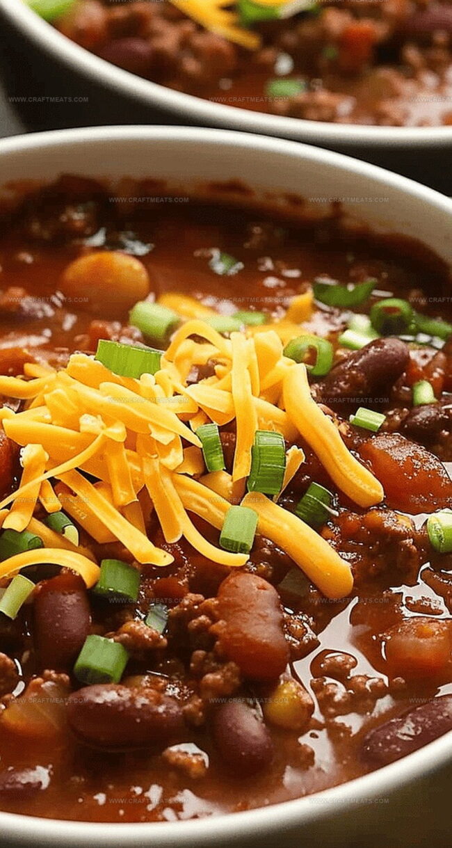 Ladle the steaming chili into bowls. Top with:Savor every comforting spoonful of this classic American comfort food!