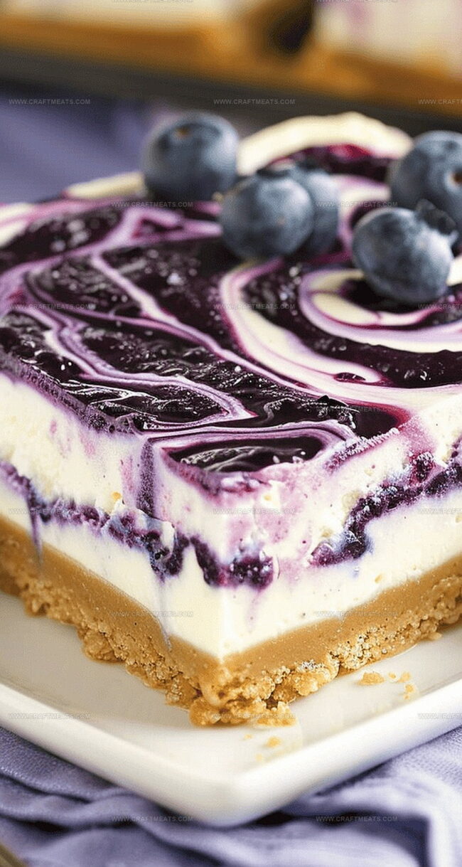Drizzle the prepared blueberry sauce over the cheesecake filling. Using a knife, create gentle swirling patterns to distribute the sauce throughout the surface. Be careful not to overmix.