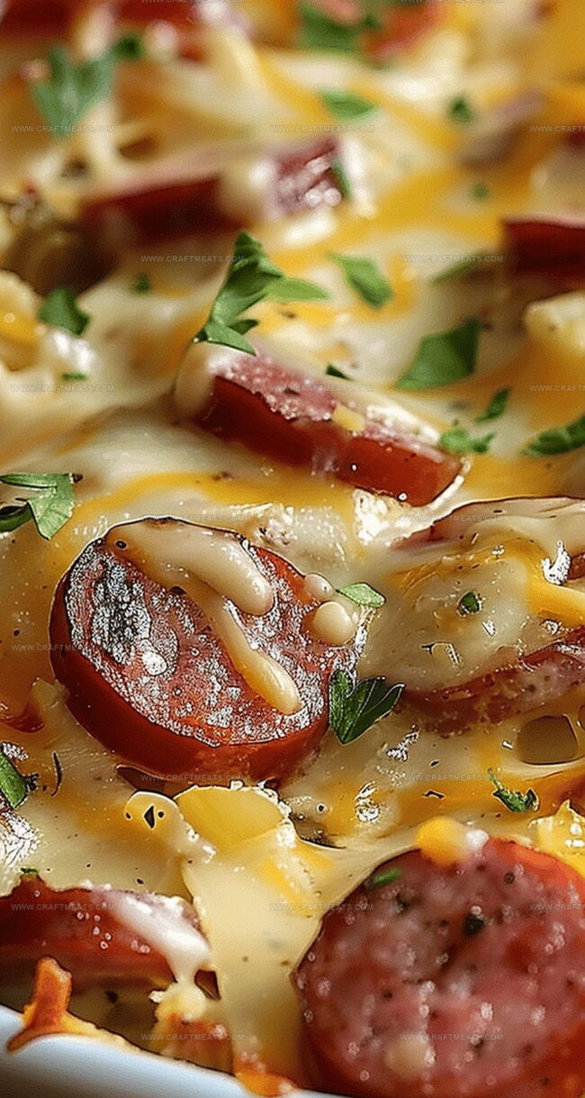 Scoop the steaming hot casserole onto plates. Watch as cheese stretches and sausage peeks through the creamy potato landscape. Gather your loved ones and savor every delicious bite of this hearty, crowd-pleasing dish.