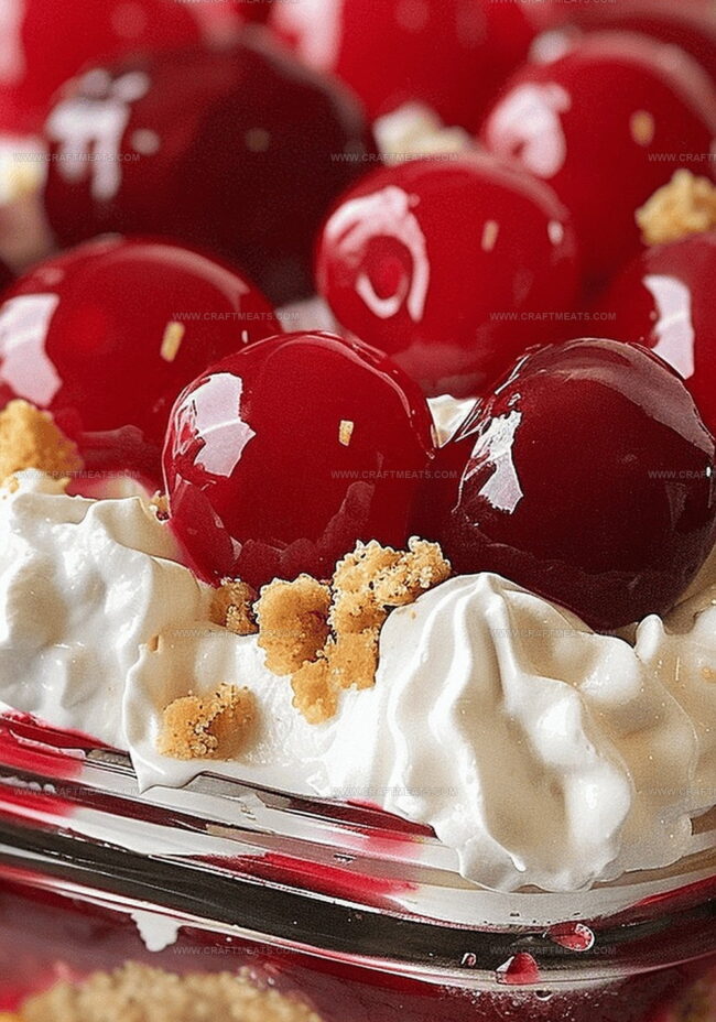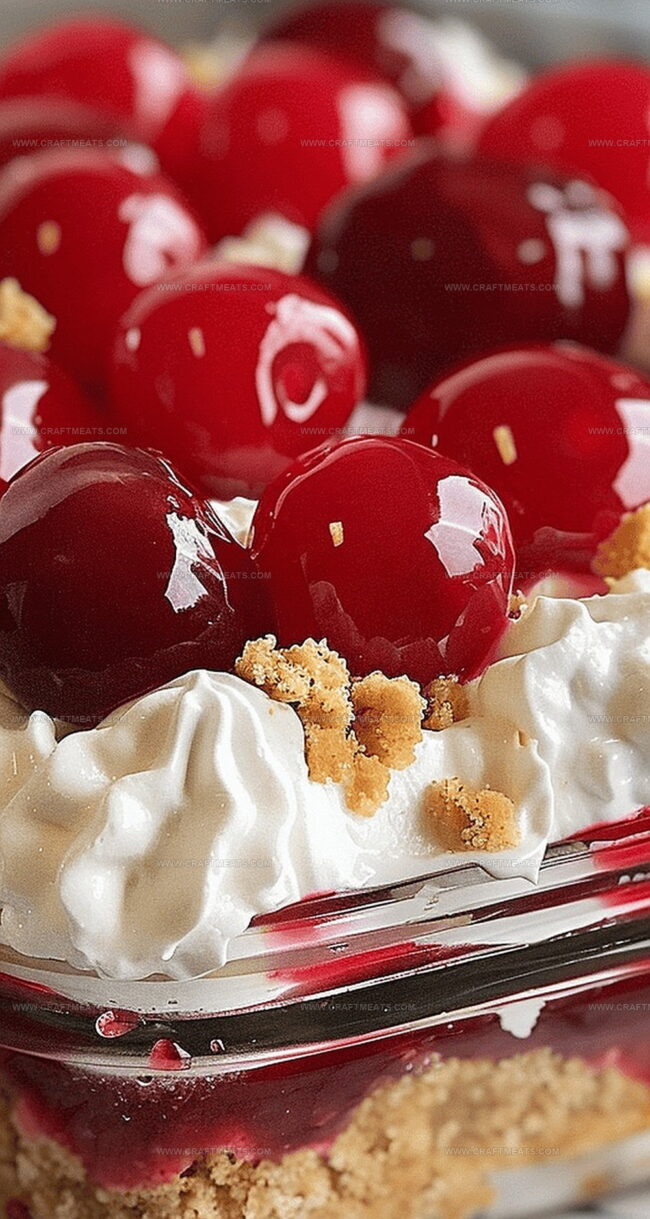 - Complete the dessert by sprinkling the remaining graham cracker mixture over the cherry layer, creating a delightful crumbly finish that adds texture and visual interest.
