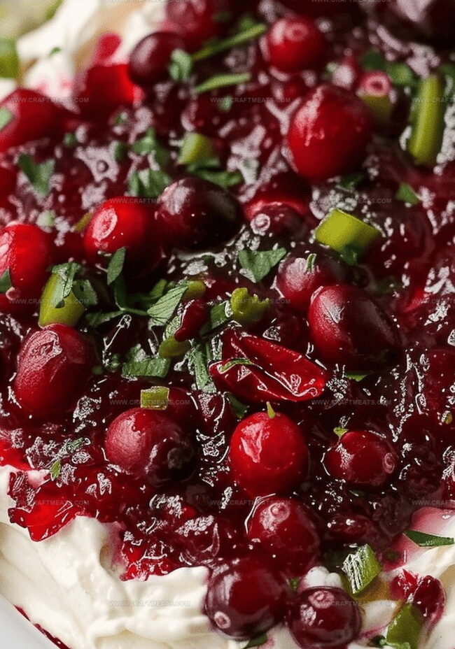 - Carefully layer the chilled cranberry mixture over the cream cheese, ensuring an elegant and uniform distribution of the vibrant red topping.