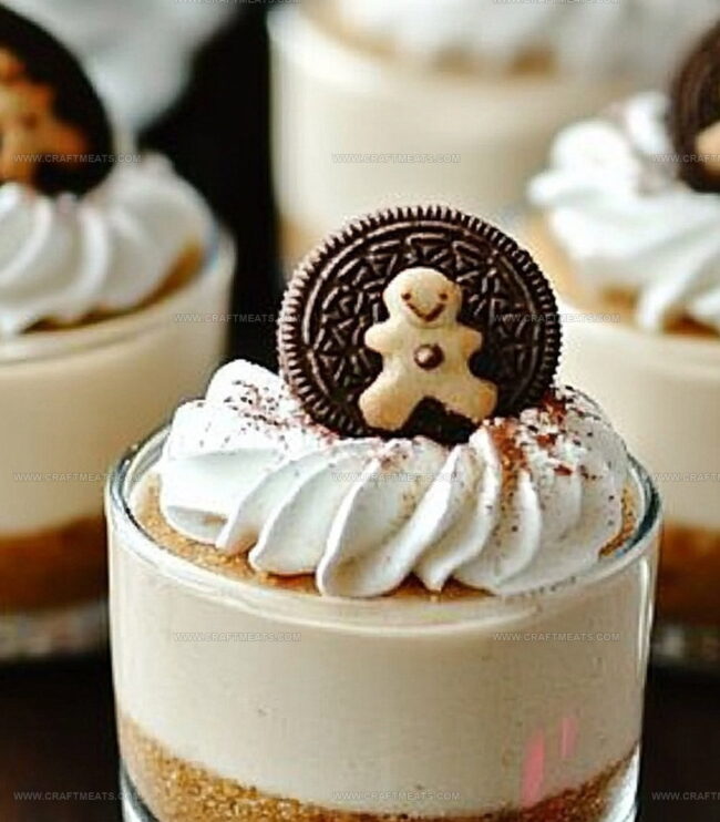 Gingerbread oreo no-bake mini cheesecakes combine festive spices with creamy cheesecake magic. Crumbly cookie crusts and silky filling make these treats perfect for holiday gatherings.