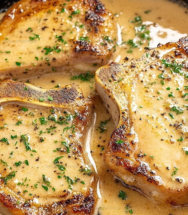 Return pork chops to the skillet, lavishly coating them with the aromatic garlic butter. Let them simmer for 1-2 minutes, allowing the flavors to mingle and intensify. Finish by scattering fresh chopped parsley on top and serving with bright lemon wedges on the side.
