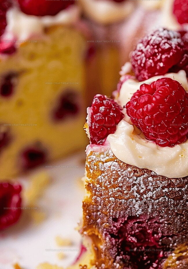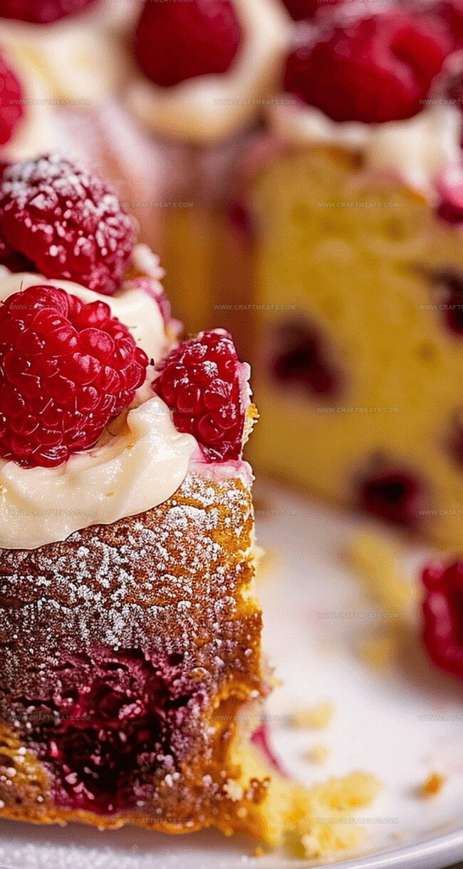 Delicate raspberries nestled throughout provide unexpected bursts of juicy sweetness against the sharp lemon backdrop.