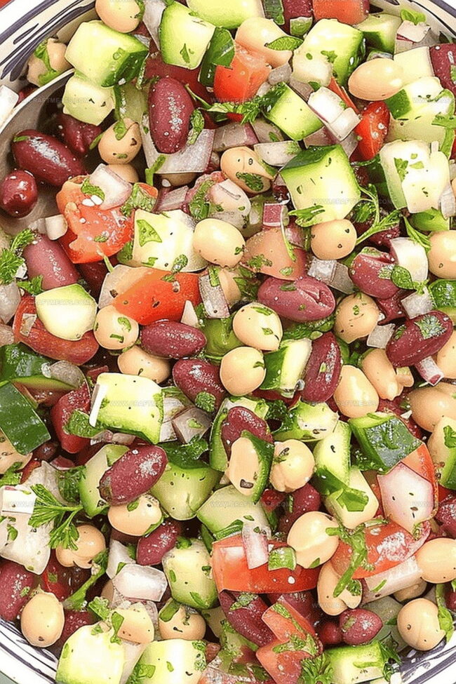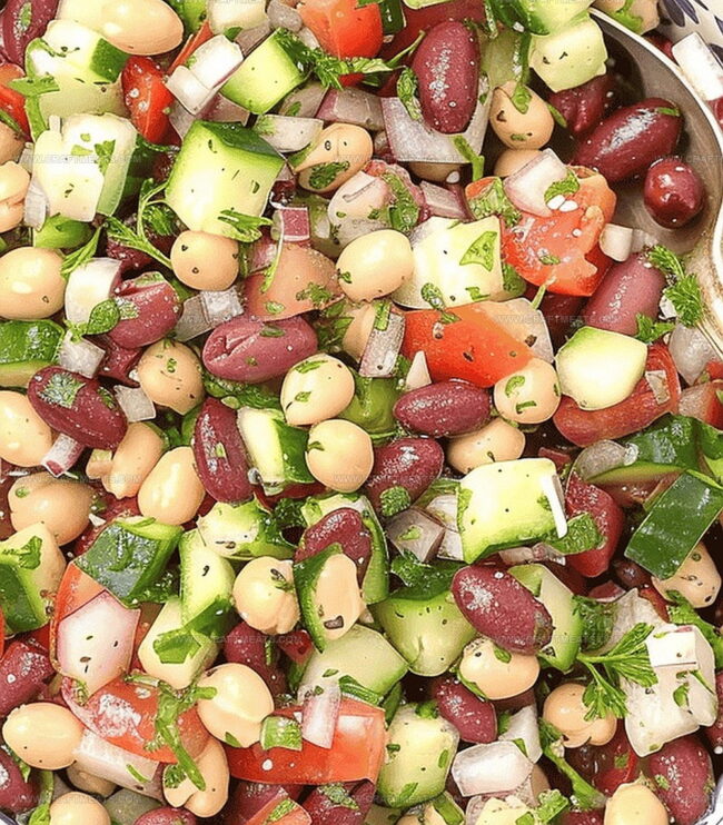 Mediterranean bean salad bursts with vibrant colors and robust flavors that dance across your palate.