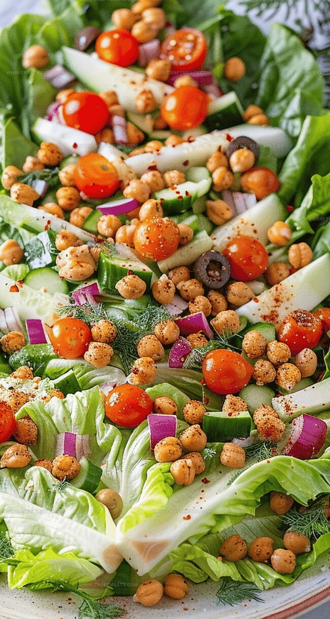 Select a beautiful platter and arrange romaine lettuce leaves:Sprinkle the crispy chickpeas and chopped vegetables across the lettuce layers. Drizzle the tahini dressing generously over the salad. Finish by crushing croutons and sprinkling them on top for an extra crunch.
