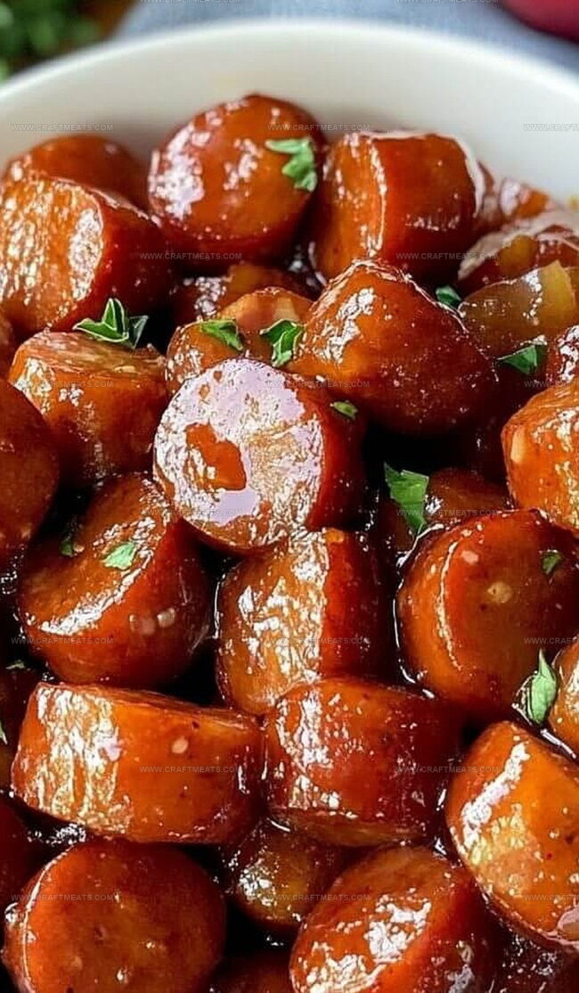 Gently stir the kielbasa bites so they’re completely coated in that incredible sauce. Want to dress them up? Sprinkle some chopped parsley on top for a pop of color and freshness.